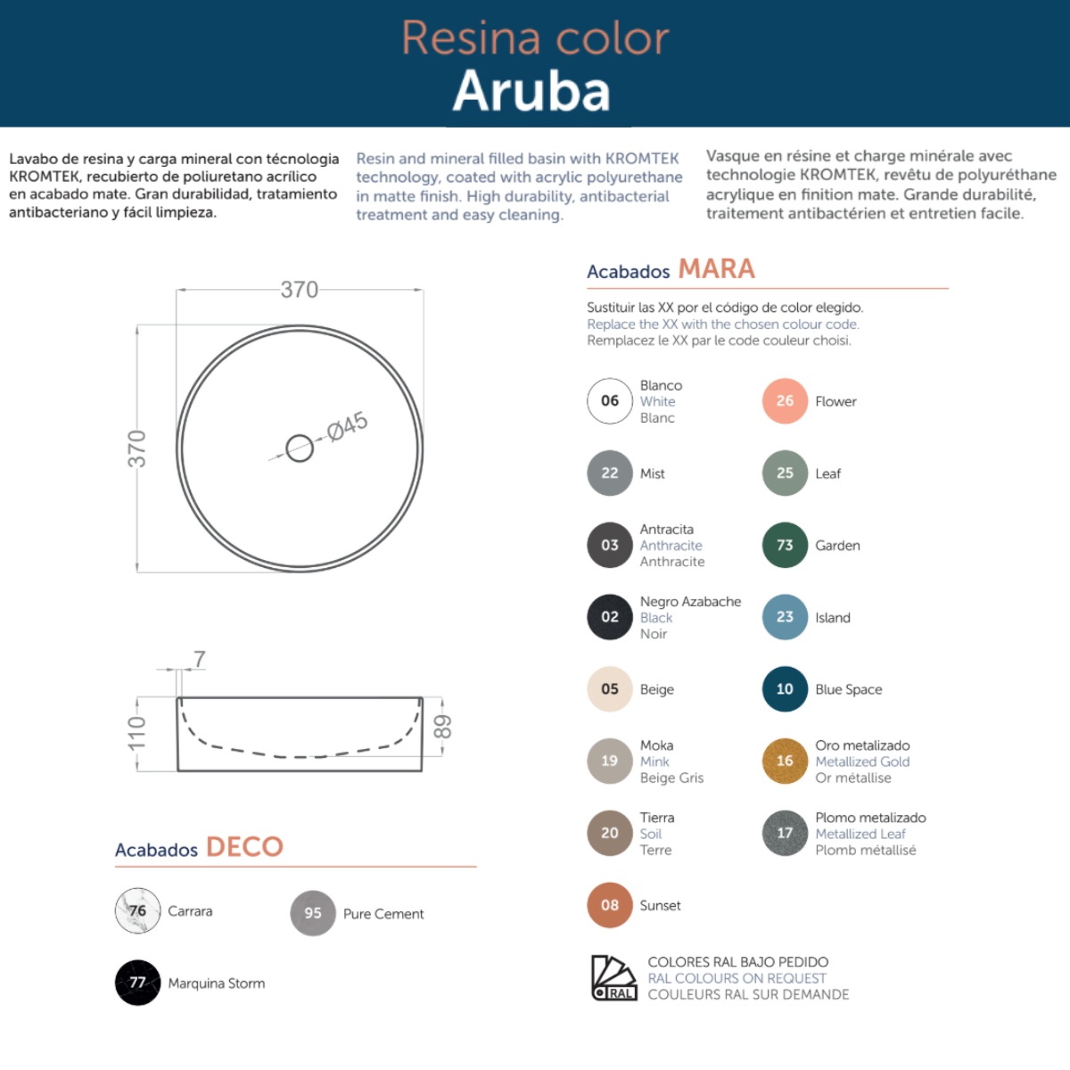 Washbasin available in gloss white, matte white or matte black.