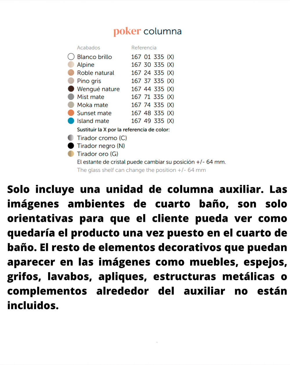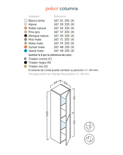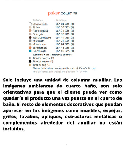 Mueble columna auxiliar para cuarto de baño modelo Poker, ideal para aumentar la capacidad de almacenamiento con dimensiones de 140cm de alto x 34,9cm de acho y 32cm de fondo. Esta columna de baño suspendida está formada por una única puerta con 4 bisagras amortiguadas.