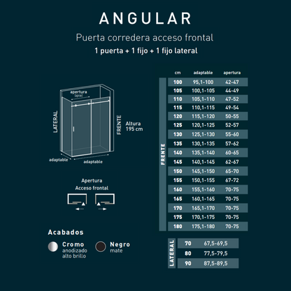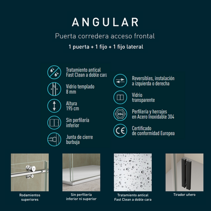Diseñada para ofrecer un acceso cómodo y elegante, la mampara Madrid combina un estilo minimalista con gran resistencia. Ideal para platos de ducha en esquina que requieren entrada frontal, esta solución incluye una puerta corredera, un fijo frontal y un lateral fijo, todos en cristal templado con tratamiento antical.