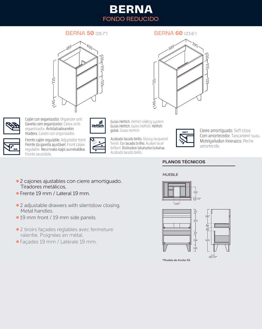 • Alta calidad: cierre amortiguado, guías Hettich y materiales resistentes al agua.