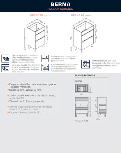 Optimiza el espacio de tu baño con el mueble de baño al suelo Berna, una opción práctica y elegante diseñada para baños pequeños. Con fondo reducido y dos cajones funcionales, este conjunto incluye lavabo cerámico y detalles personalizables en color blanco brillo o roble natural.