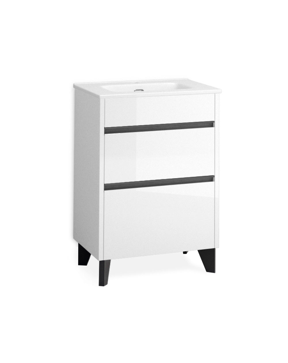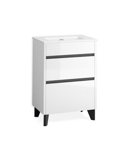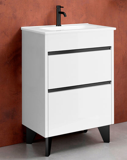 Berna Mueble de Baño al Suelo con Lavabo Cerámico de Fondo Reducido | 2 Cajones con Cierre Amortiguado y Organizador | Blanco Brillo -