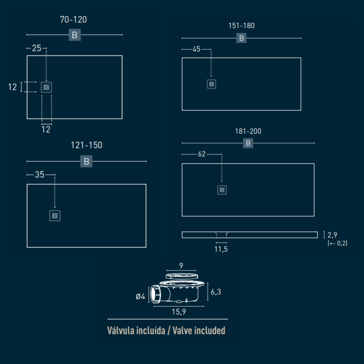 Composición : Plato de ducha + válvula + rejilla acero inoxidable