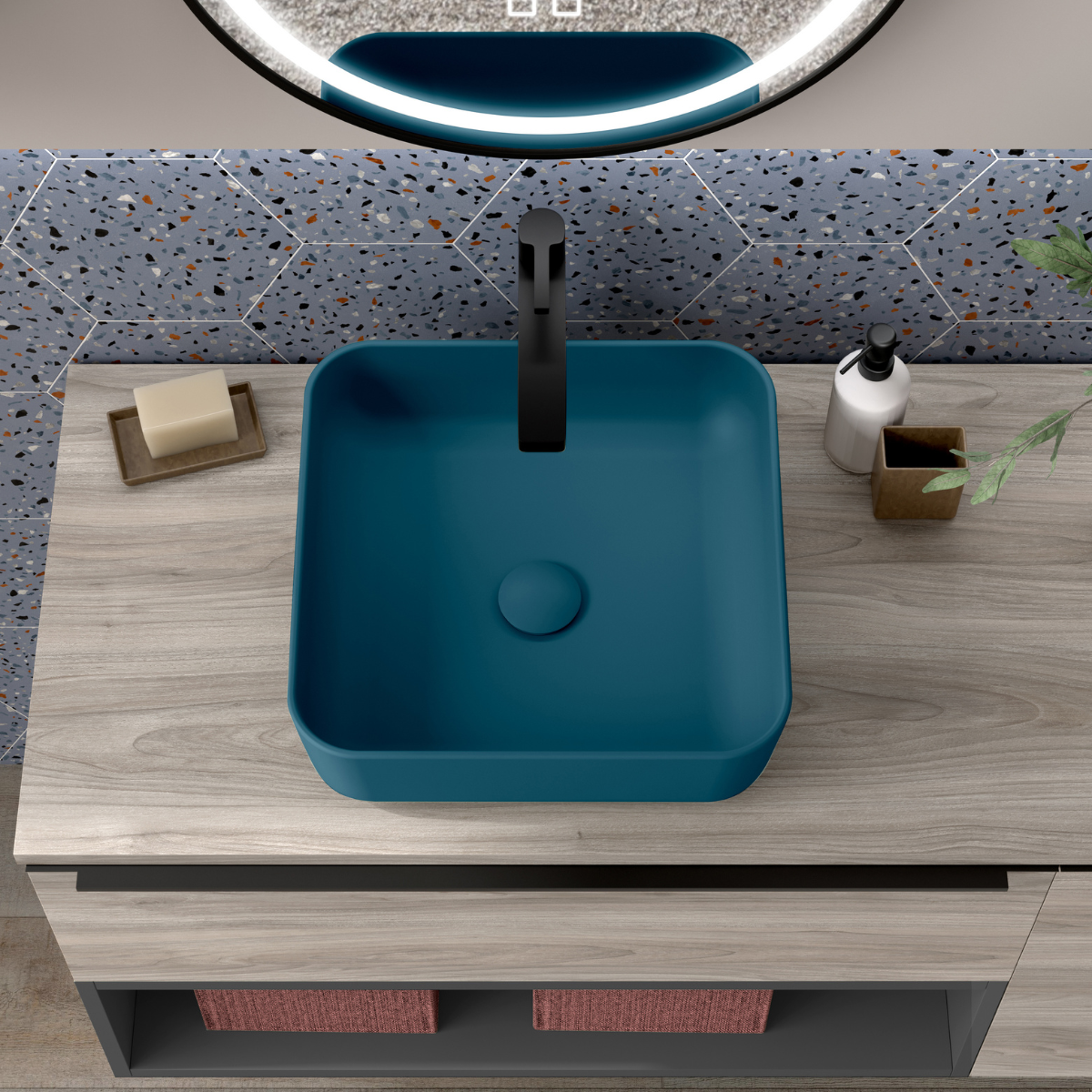 A pia de bancada oval tem 40cm de diâmetro e 16cm de altura.