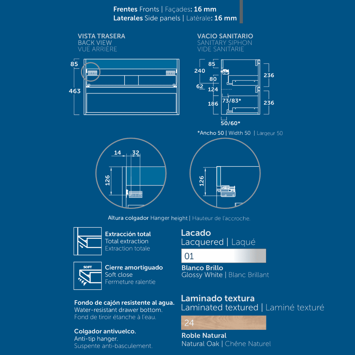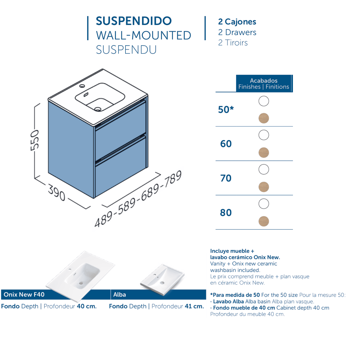 • Fácil instalación: mueble ya montado, solo acoplar el lavabo.